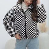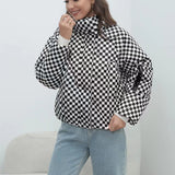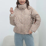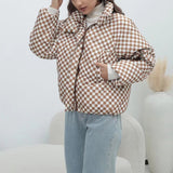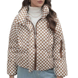 Genießen Sie kuschelige Lagen mit dieser schicken winddichten Steppjacke, die ein erdtonfarbenes Schachbrettmuster aufweist und Ihrem Look eine subtile Struktur verleiht. Der Stehkragen hält Sie an kühlen Tagen warm, während Reißverschlusstaschen sicheren Platz für Ihre Essentials bieten. Der lockere Schnitt macht das Layering an kühlen Morgen, Wochenendspaziergängen oder lässigen Stadtbummel mühelos. Hergestellt aus strapazierfähigen Materialien, wurde sie entwickelt, um Ihnen Komfort und Schutz zu bieten, egal wohin Sie Ihr Tag führt.