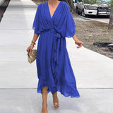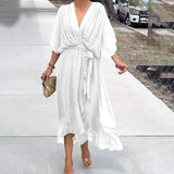 Vielseitiger Stil: Der feminine V-Ausschnitt und die fließende Passform machen das Kleid zu einem Allrounder – für Alltag und besondere Momente.