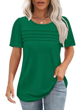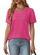 Das locker geschnittene Shirt überzeugt mit zarten Falten vorne, die die Brust sanft umspielen und eine schmeichelhafte Silhouette schaffen. Die kurzen Puffärmel kaschieren die Arme, während der abgerundete Saum für eine moderne Note sorgt und lang genug ist, um auch mit Leggings getragen zu werden.