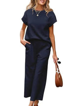 Dieses zweiteilige Lounge-Set überzeugt durch seine strukturierte Optik und lockere Passform. Das Oberteil mit Rundhalsausschnitt und kurzen Ärmeln fühlt sich angenehm weich an und sorgt für einen modernen, zurückhaltenden Look.