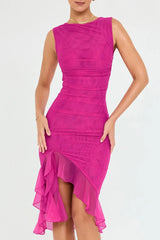 Das Zoey Kleid verfügt über einen asymmetrischen Rock mit einem transparenten, plissierten Einsatz, der fließende Bewegung und subtile Details hinzufügt. Die figurbetonte Bodycon-Form und der klassische Rundhalsausschnitt betonen Ihre Silhouette und machen es zur perfekten Wahl für Abende, besondere Anlässe oder formelle Abendessen.
